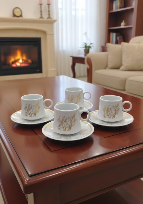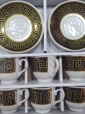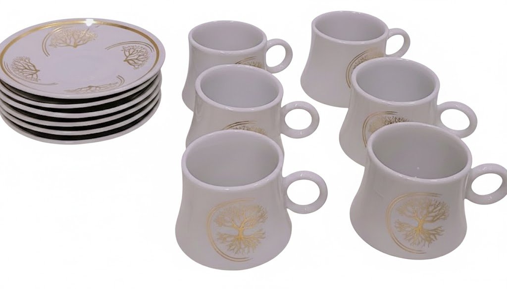 جدد مائدتك بلمسة أناقة مستوحاة من الطبيعة! طقم القهوة البورسلين الفاخر المكون من 6 فناجين و 6 أطباق، يتميز بتصميم شجرة الحياة الذهبية الجذاب. لا تفوت الفرصة!