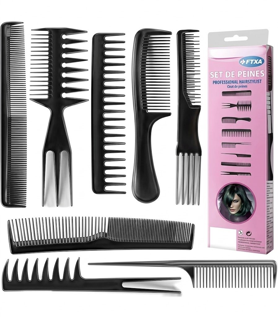 طقم أمشاط تصفيف احترافي متكامل مكون من 8 قطع، مصمم بمرونة عالية وأشكال متنوعة لتلبية كافة احتياجات تصفيف وفك تشابك الشعر في المنزل أو الصالون.
