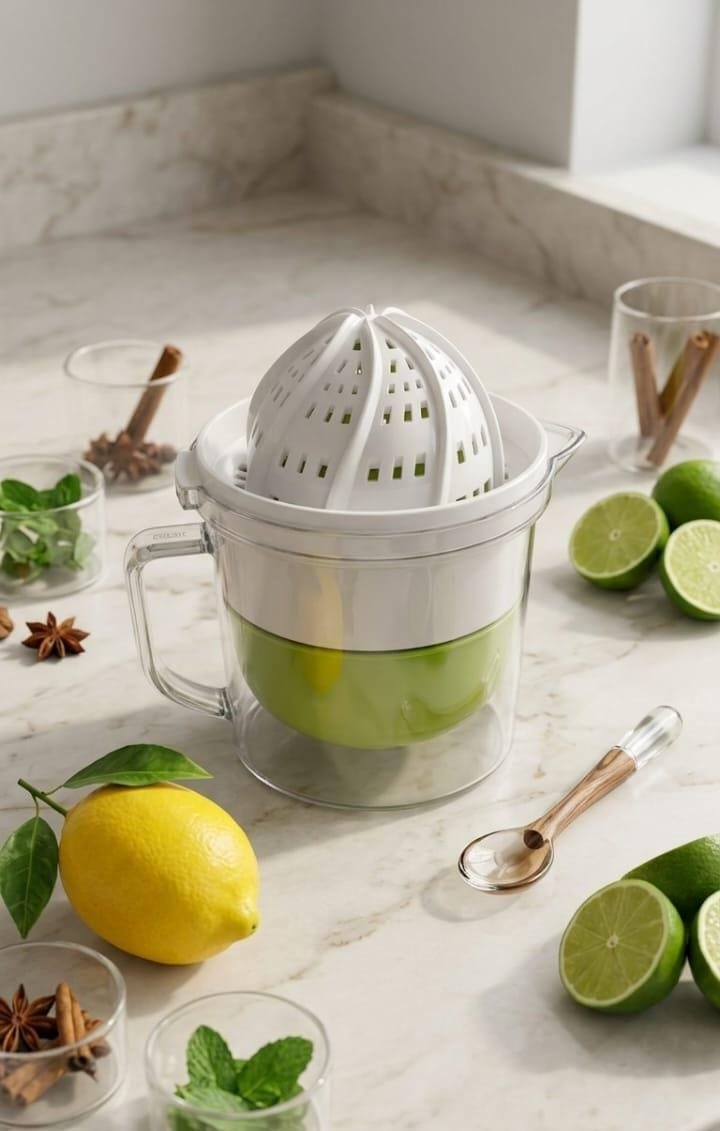 - تصميم ذكي وعملي: تتكون من رأس عصارة قوي لاستخراج العصير بكفاءة، متصل بوعاء تجميع شفاف يتيح لك رؤية كمية العصير.