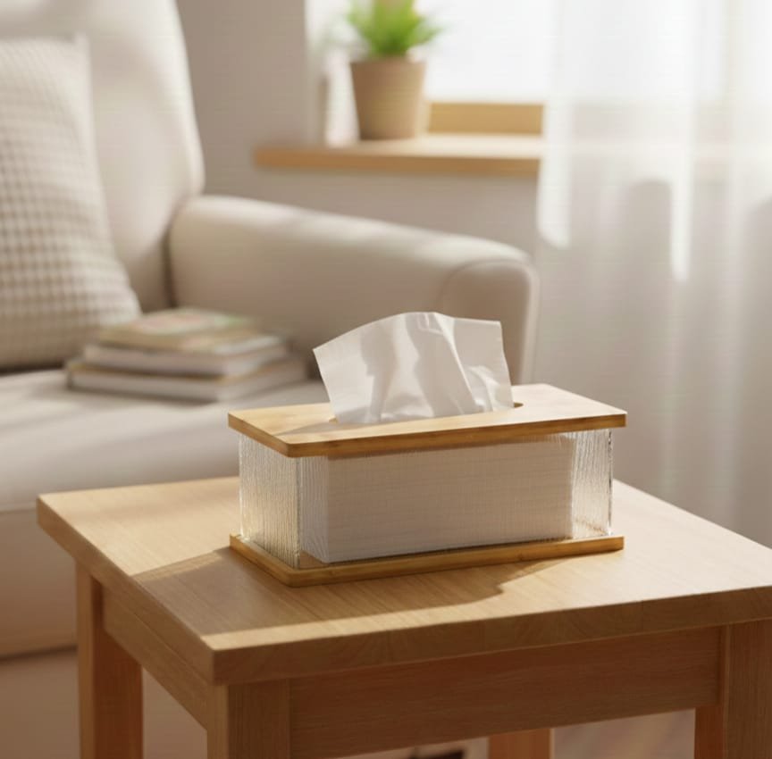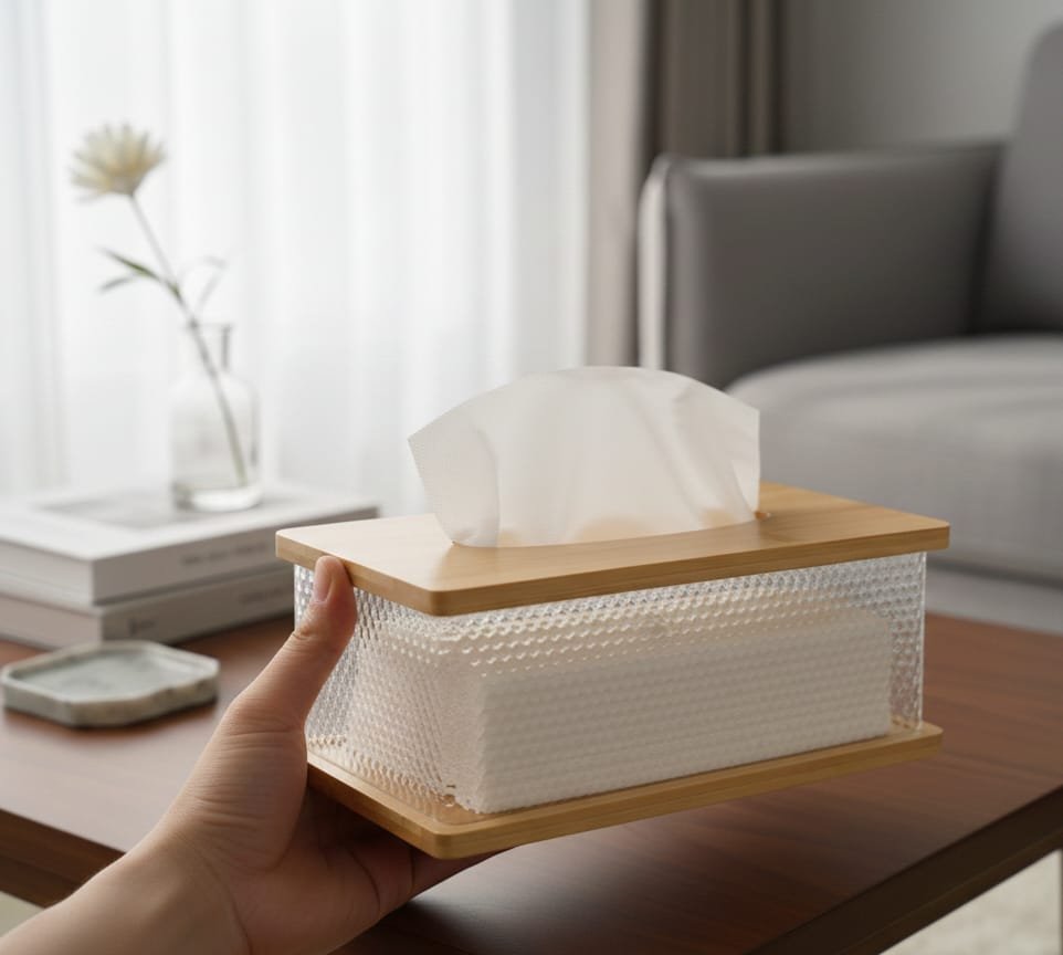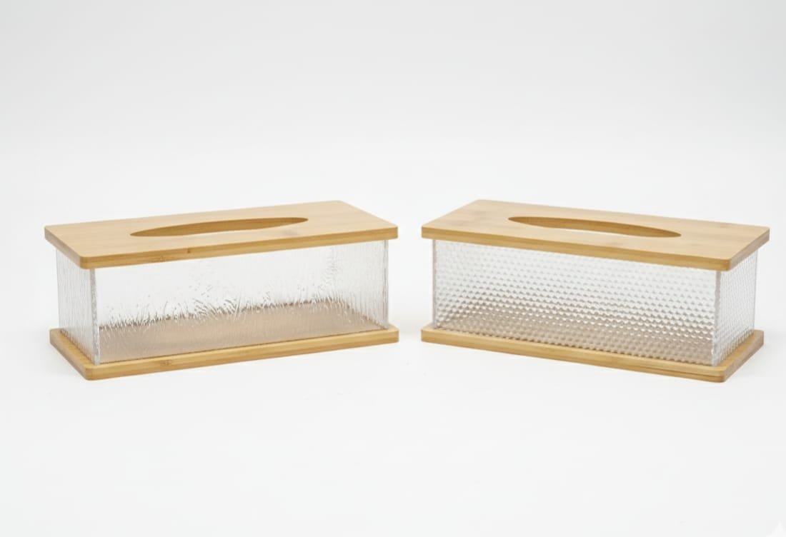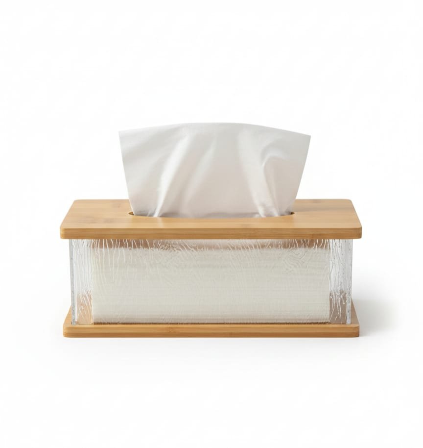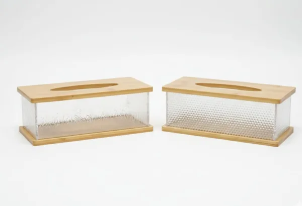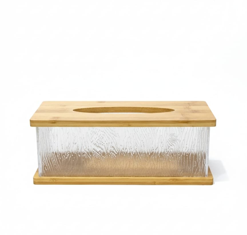 تتميز هذه الحافظة بتصميم يدمج بين الوظيفة العملية والجمالية الراقية. تتكون من جسم مصنوع من الأكريليك المتين والشفاف، مما يتيح رؤية كمية المناديل المتبقية بسهولة، مع قاعدة وغطاء علوي من خشب البامبو الطبيعي. يتوفر جسم العلبة بنقوش مختلفة، منها المضلع (Vertical ribs) والمنقرش (Wavy texture)، مما يعطيها مظهراً يشبه الكريستال ويضيف لمسة من الفخامة للديكور. العلبة سهلة التنظيف وإعادة التعبئة، وتعتبر قطعة ديكور مثالية للمنازل الحديثة أو المكاتب.