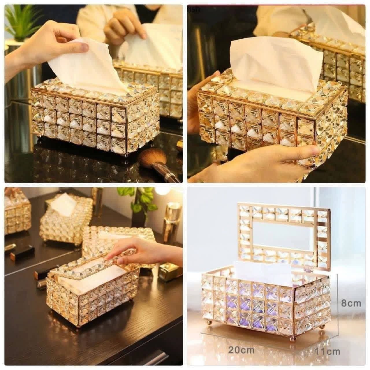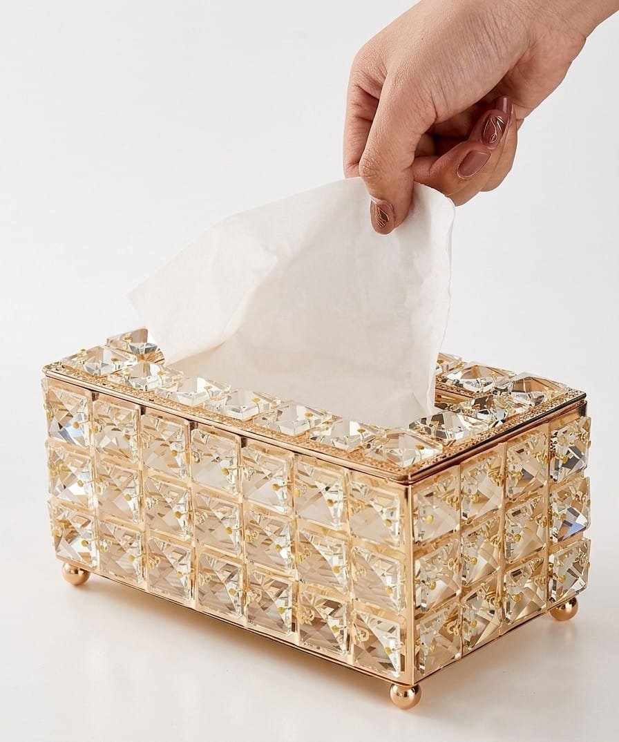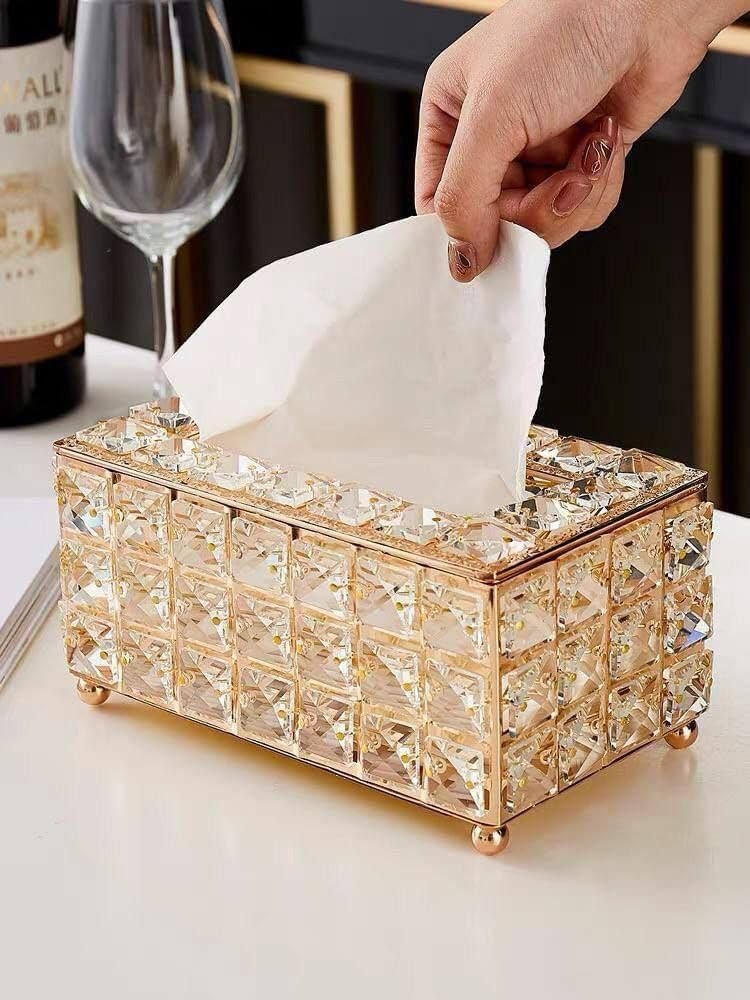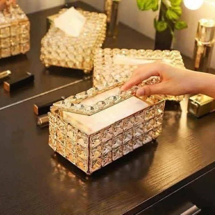 تتميز هذه العلبة بتصميم أوروبي راقٍ يجمع بين الفخامة والوظيفة العملية. العلبة مصنوعة من هيكل معدني متين مطلي باللون الذهبي، مرصع يدويًا بقطع من الكريستال الصناعي الشفاف الذي يعكس الإضاءة بشكل جمالي ملفت. تأتي العلبة بشكل مستطيل مع أربع أرجل كروية ثابتة تمنع الانزلاق، وتتميز بفتحة علوية واسعة لسهولة سحب المناديل دون تمزق. تُعد قطعة ديكور مثالية لغرف النوم، غرف المعيشة، أو حتى طاولات الزفاف والمطاعم الفاخرة.