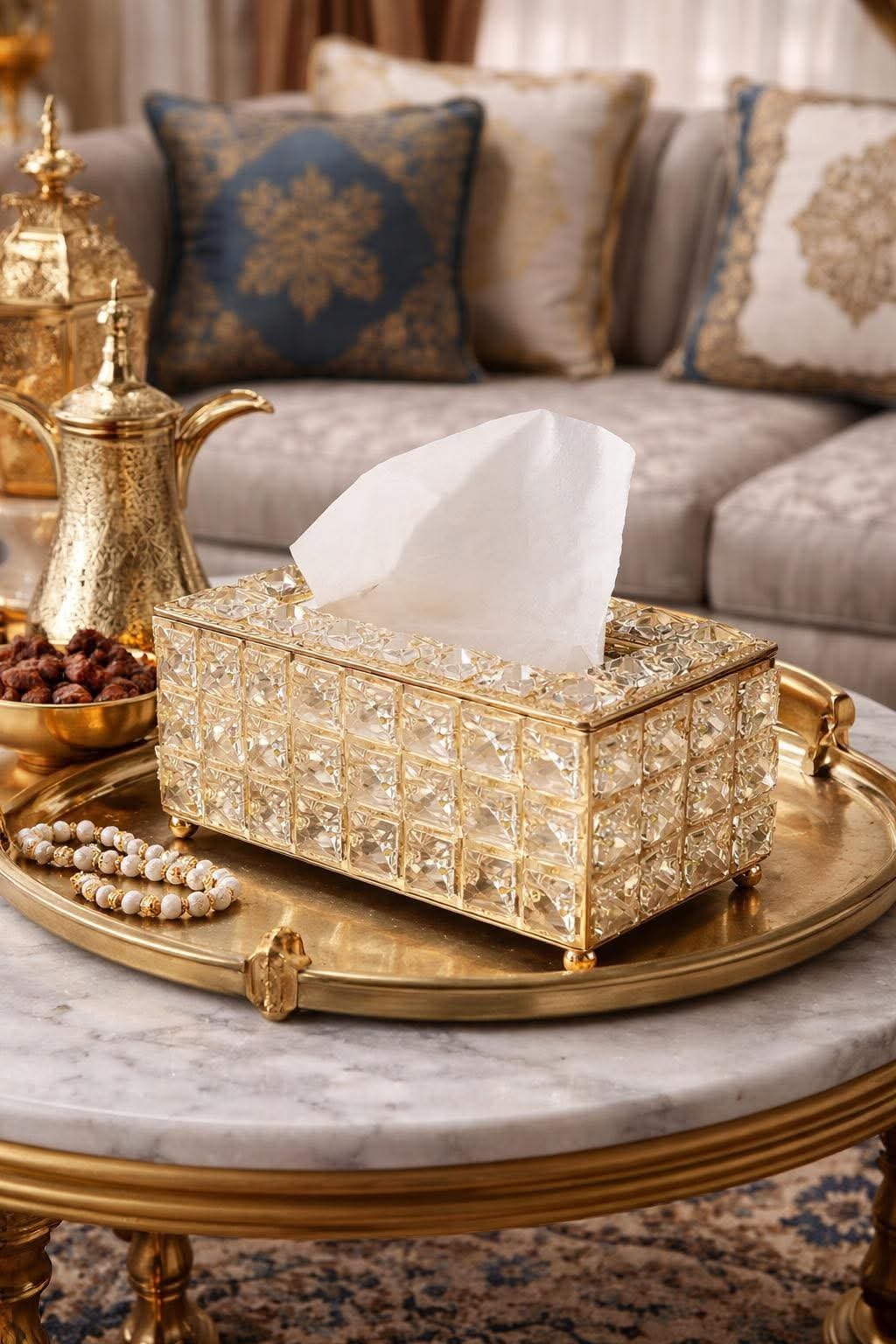 علبة مناديل كريستال فاخرة بتصميم مستطيل ولون ذهبي لامع، تضيف لمسة من الأناقة العصرية لديكور المنزل أو المكتب.