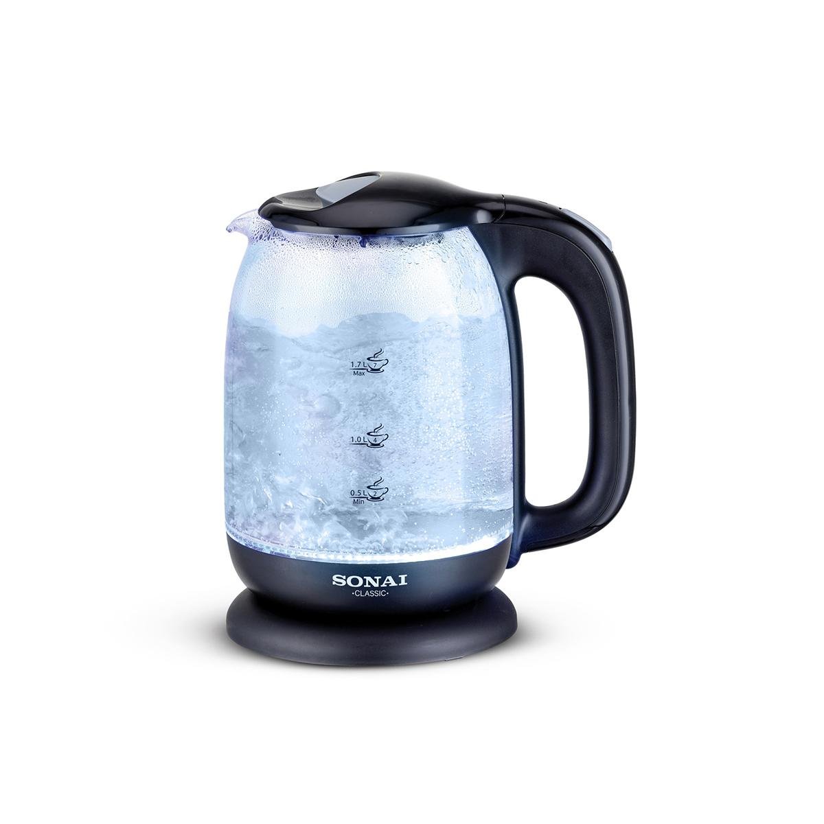 غلاية سوناي كلاسيك هي جهاز أنيق وعملي، بقوة 2200 واط لغليان سريع للمياه، وسعة 1.7 لتر مناسبة للعائلة. تتميز بتصميم زجاجي أنيق مع إضاءة LED ساطعة أثناء التشغيل وقاعدة تدور 360 درجة.