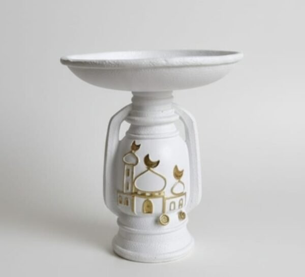 ارفع مستوى ضيافتك خلال شهر رمضان والأعياد مع حامل التقديم الفاخر هذا. يتميز التصميم بقاعدة متينة على شكل فانوس أبيض مزخرف بنقوش إسلامية وخطوط ذهبية أنيقة، تعلوها صينية دائرية واسعة. هذا الستاند مصنوع من مادة تشبه البورسلين عالي الجودة (أو البولي) لضمان المتانة ومظهر لامع وراقي. إنه مثالي لتقديم التمور، الحلويات، المكسرات، أو كقطعة ديكور مركزية تضيف لمسة احتفالية ودافئة إلى طاولة الطعام أو أي ركن في المنزل.