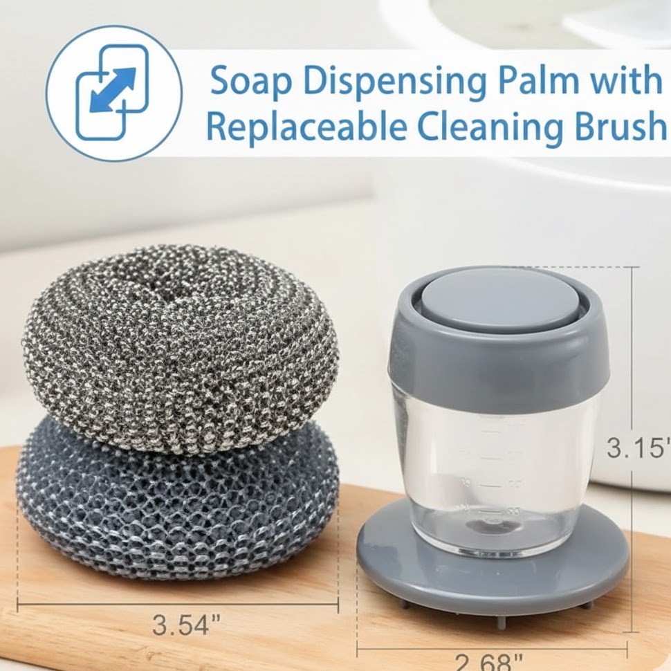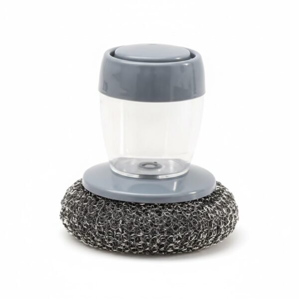 فرشاة تنظيف عملية ومريحة بحجم راحة اليد مزودة بخزان صابون مدمج. تتميز برأس سلكي من الفولاذ المقاوم للصدأ قوي وفعال في إزالة البقع والشحوم الصعبة دون خدش الأواني. ببساطة اضغط للتحكم في كمية الصابون الموزعة.
