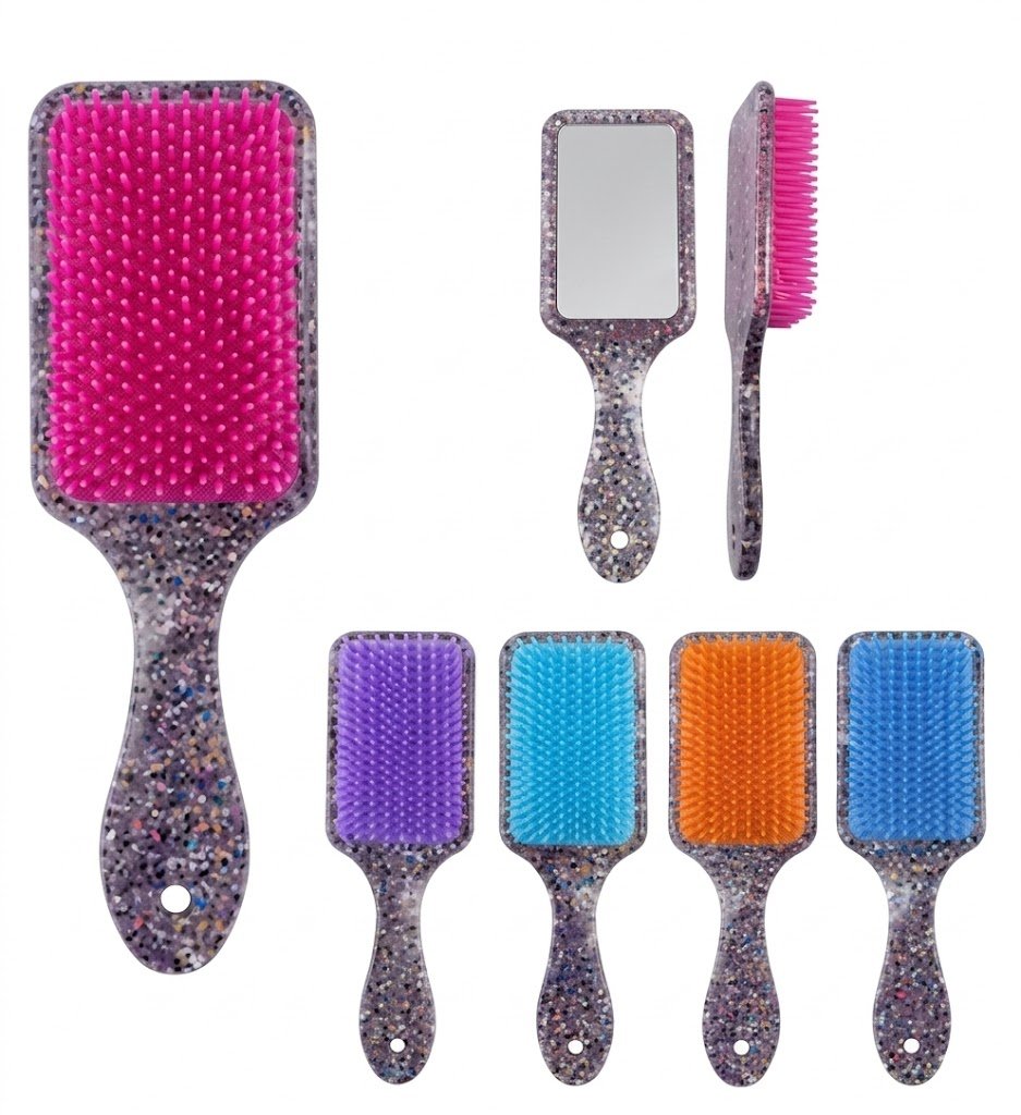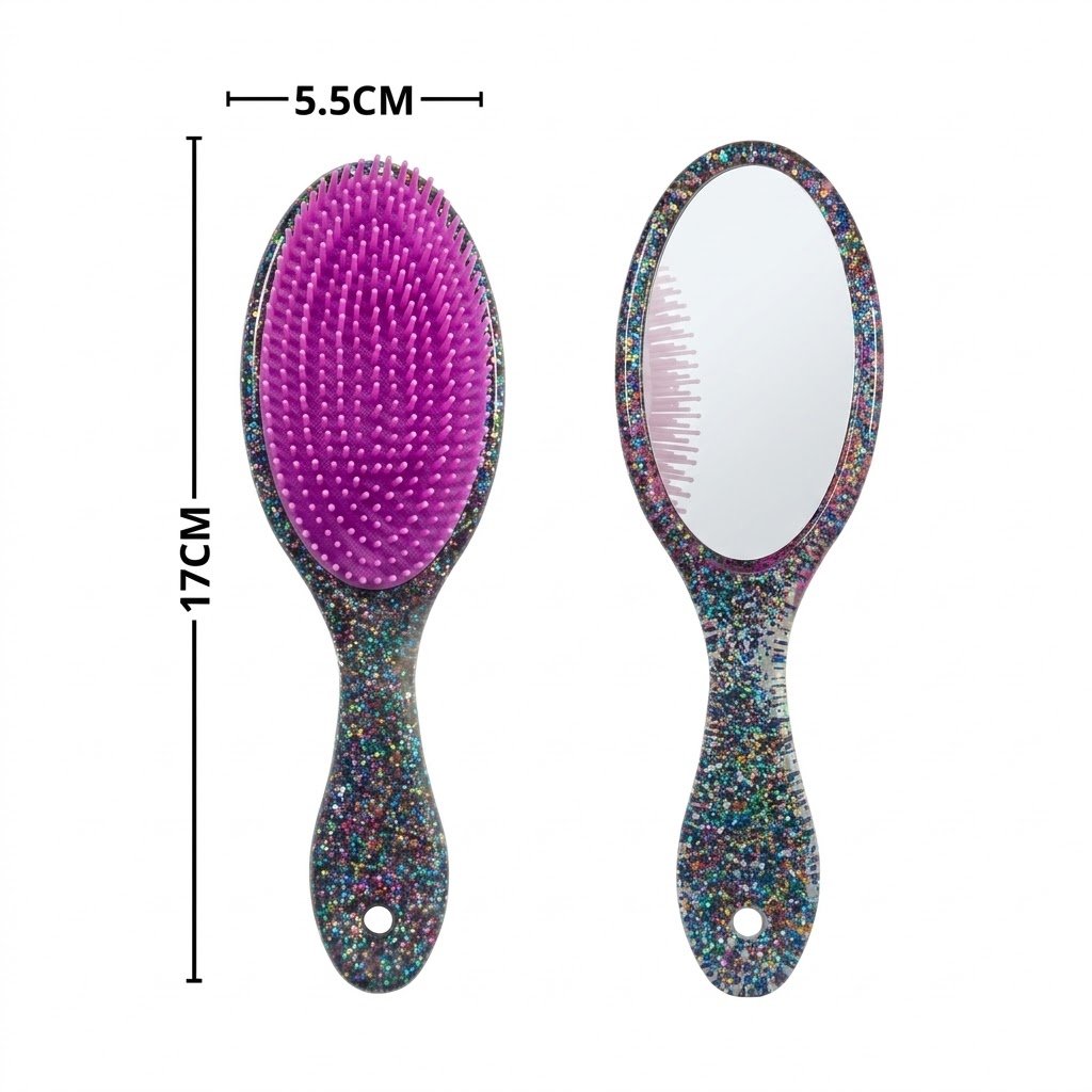 فرشاة شعر “لوكس” بيضاوية , مربع بتصميم جليتور ساحر، مزودة بمرآة خلفية لتجمع بين الأناقة والعملية في قطعة واحدة تلمع في حقيبتك.