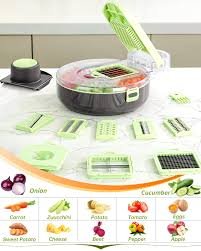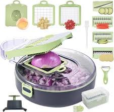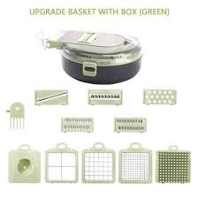 - تعدد الوظائف: تتضمن 8 شفرات قابلة للتبديل (للمكعبات، الشرائح، البشر الخشن والناعم، والشيبس المموج)، بالإضافة إلى مقشرة، وفاصل لصفار البيض، وفرشاة تنظيف.