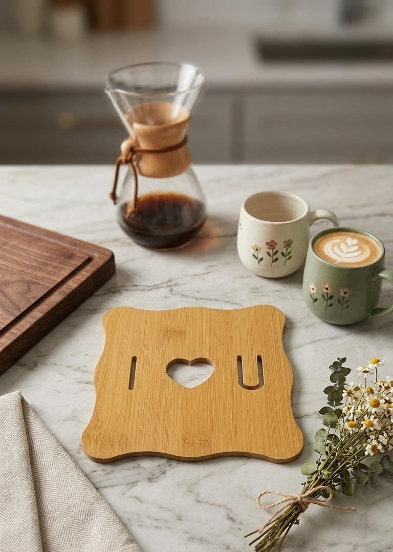 اجعل مائدتك تنبض بالمشاعر مع قاعدة الأواني الخشبية الفريدة. تتميز بتصميم مفرغ يحمل رسالة “I Love You” (حرف I، قلب، وحرف U)، مما يجعلها هدية مثالية أو إضافة جمالية دافئة لمنزلك تجمع بين العملية والفن.