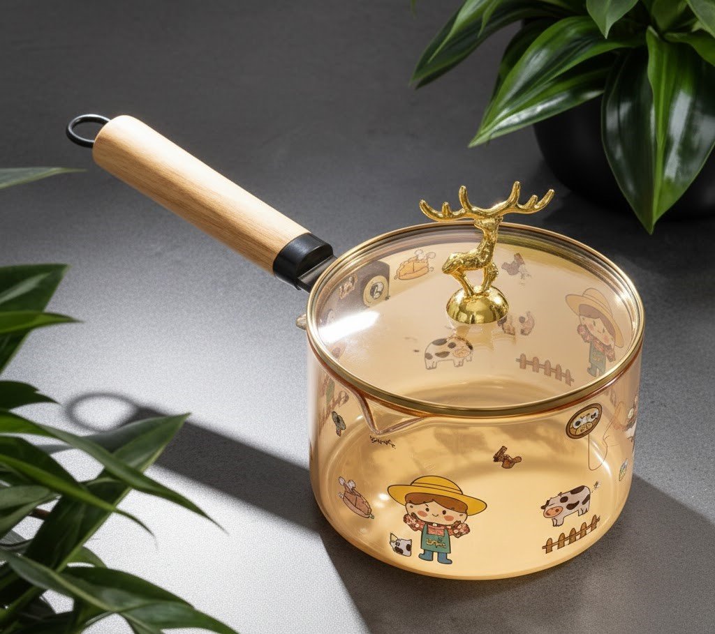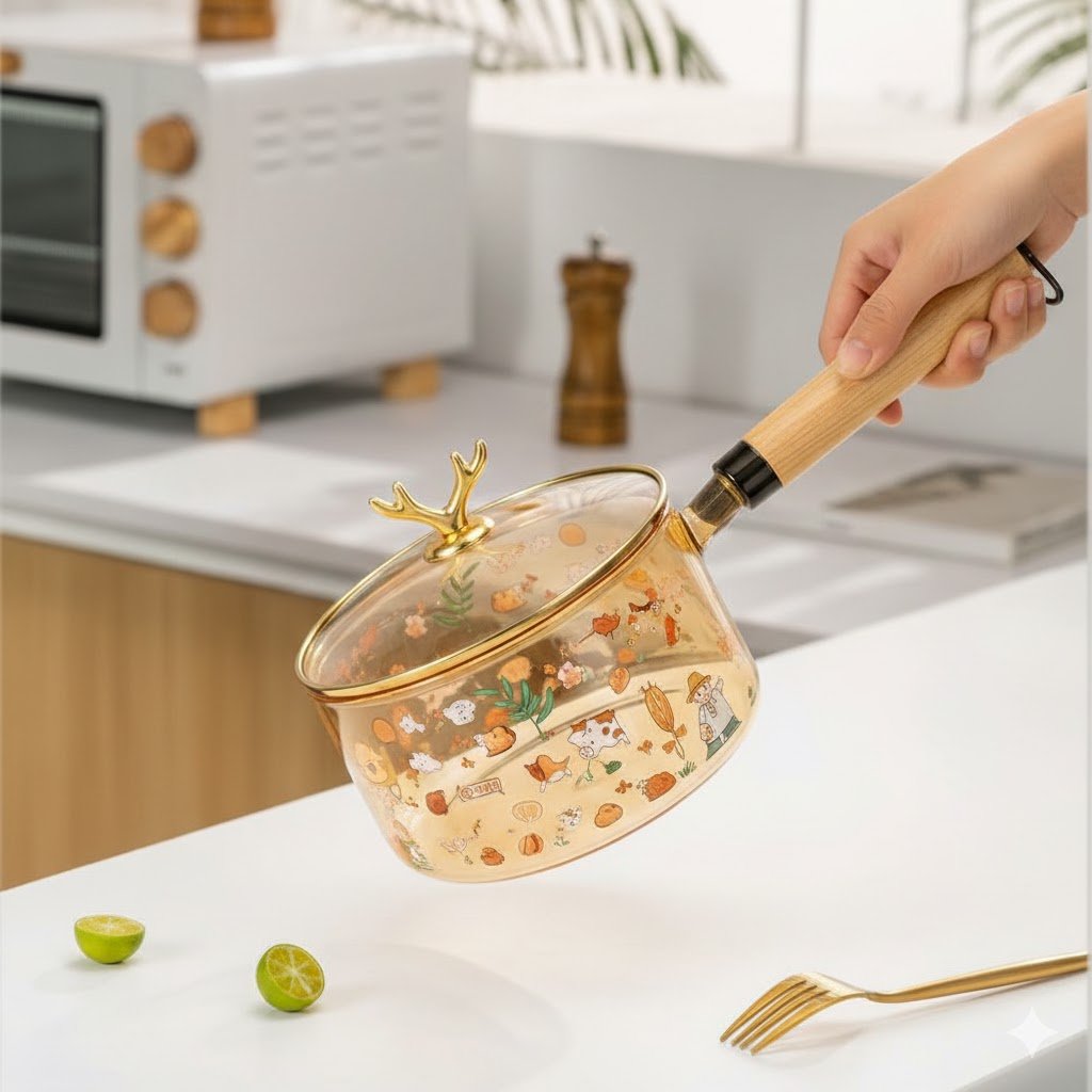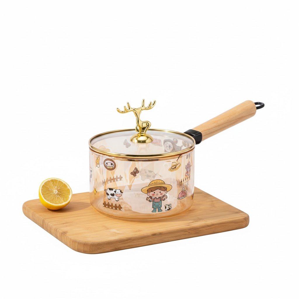 تتميز اللبانة برسومات كرتونية مبهجة تضفي طابعًا فريدًا على أدوات المطبخ. المقبض الطويل الجانبي والمقبض الموجود على الغطاء مصنوعان من الخشب الطبيعي، مما يوفر قبضة مريحة ويظل باردًا أثناء الاستخدام. التصميم الشفاف يتيح لك مراقبة المحتويات بسهولة. هذه اللبانة عملية للغاية، صحية، سهلة التنظيف، ومثالية لغلي الحليب أو الماء أو تحضير الوجبات الخفيفة الساخنة.
