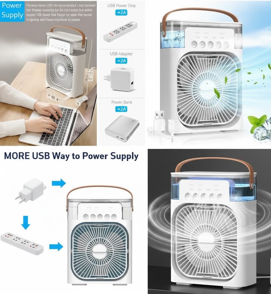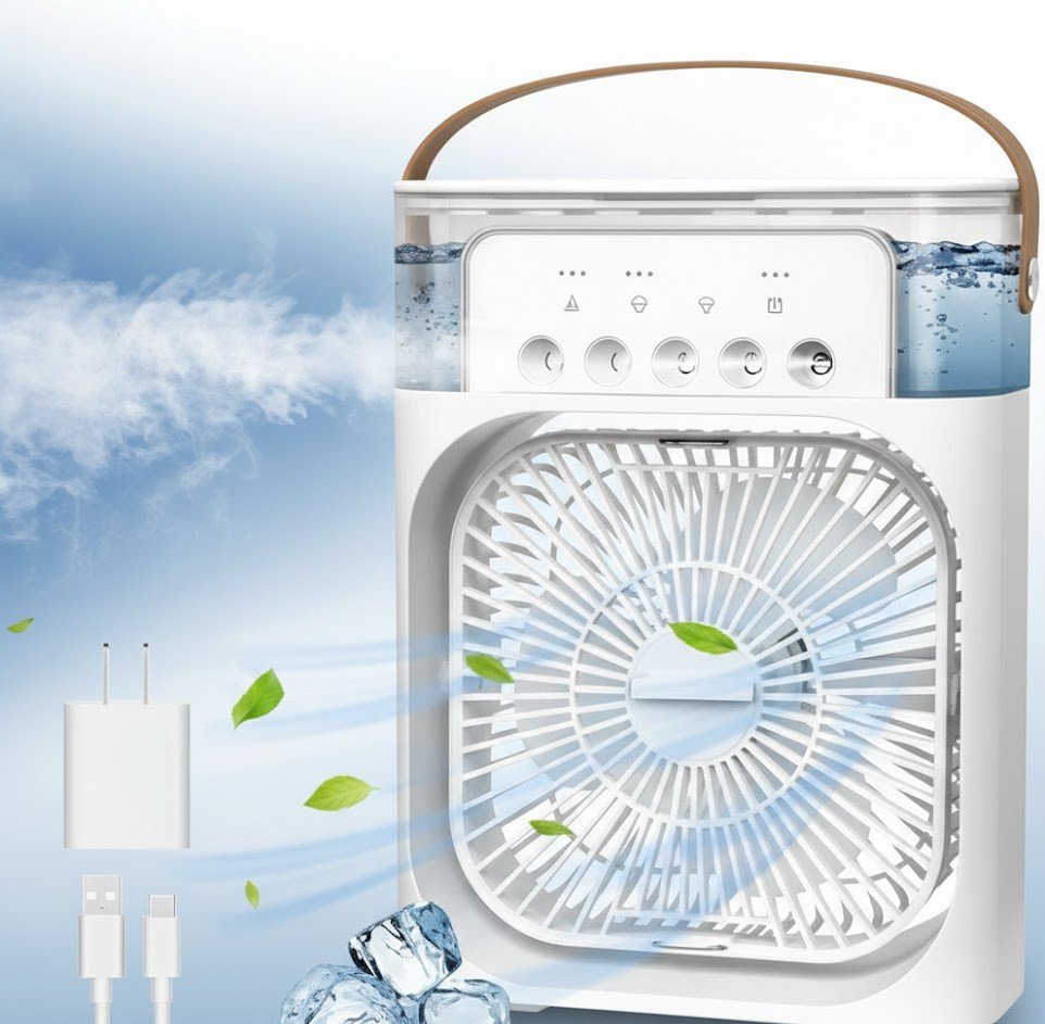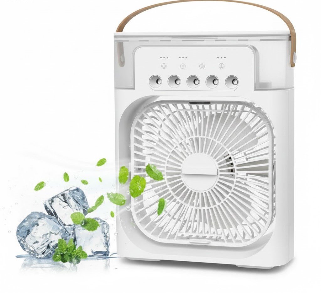 مكيف الهواء المحمول “AIR COOLER FAN”: تبريد شخصي، رذاذ ماء، وإضاءة LED!