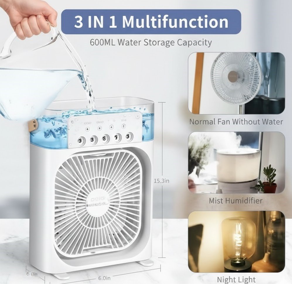 هذا الجهاز المدمج والخفيف الوزن هو الحل الأمثل لمواجهة الحرارة والجو الجاف، حيث يجمع بين وظائف المروحة، ومكيف الهواء، وجهاز الترطيب، والإضاءة الليلية في وحدة واحدة. سواء كنت في العمل أو المنزل أو أثناء التخييم، فإنه يوفر لك الراحة والانتعاش طوال الوقت بفضل الميزات التالية: