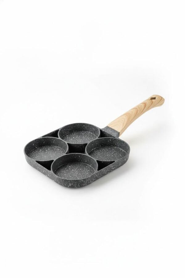 مقلاة جيرانيت 4 عيون للطهي السريع والسهل. مثالية لعمل 4 بيضات، بان كيك، أو برجر في وقت واحد دون اختلاط النكهات. طلاء مانع للالتصاق لطهي صحي بمواد أقل من الزيت ومقبض خشبي مريح وآمن.