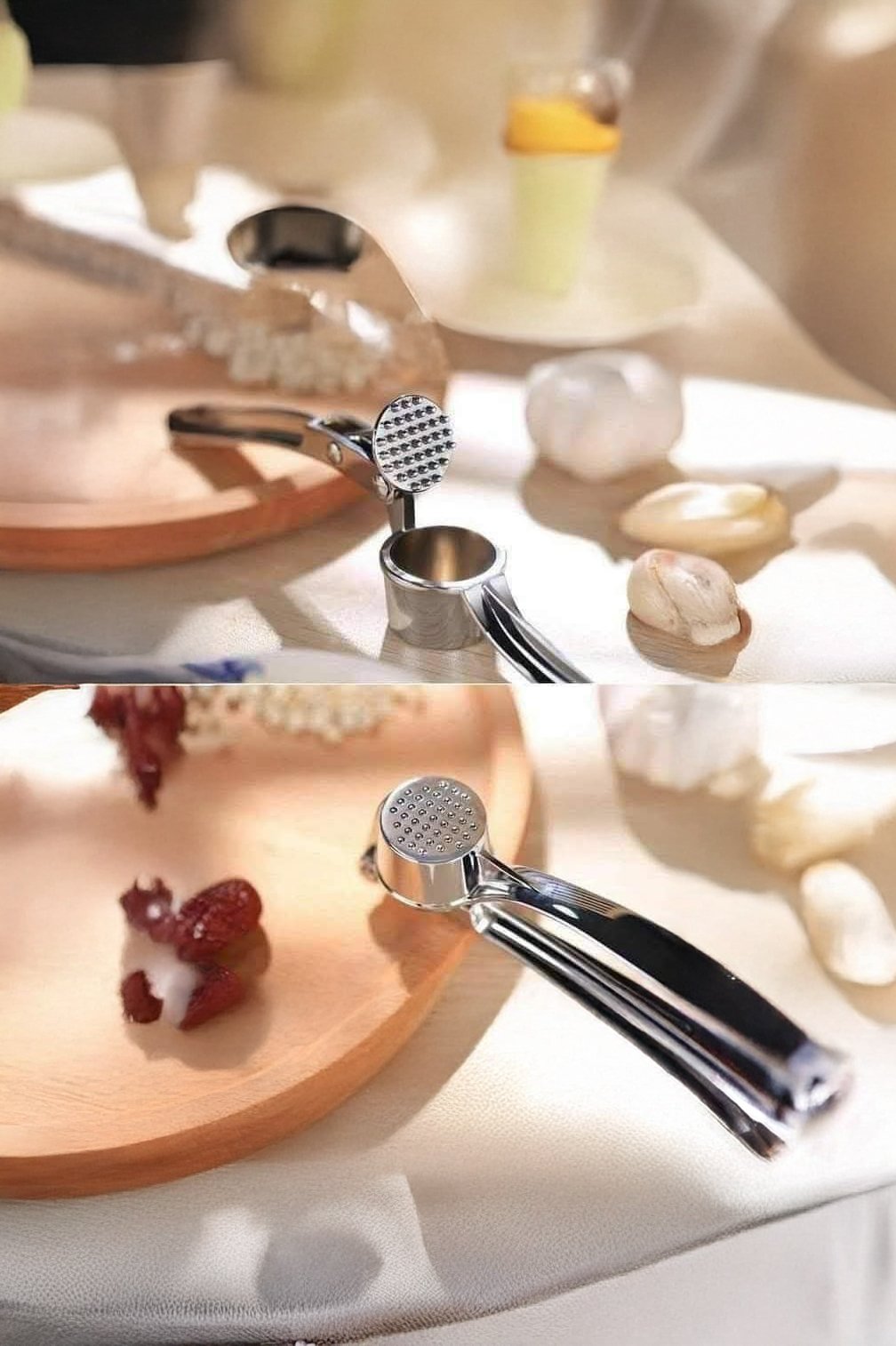 بالإضافة إلى الثوم، يمكنكِ استخدامها لهرس الزنجبيل الطازج أو بعض المكسرات الصغيرة. يضمن السطح الأملس للستانلس ستيل عدم تراكم بقايا الطعام، كما أن تصميمها يسمح بتنظيفها بسهولة تحت الماء الجاري أو في غسالة الأطباق
